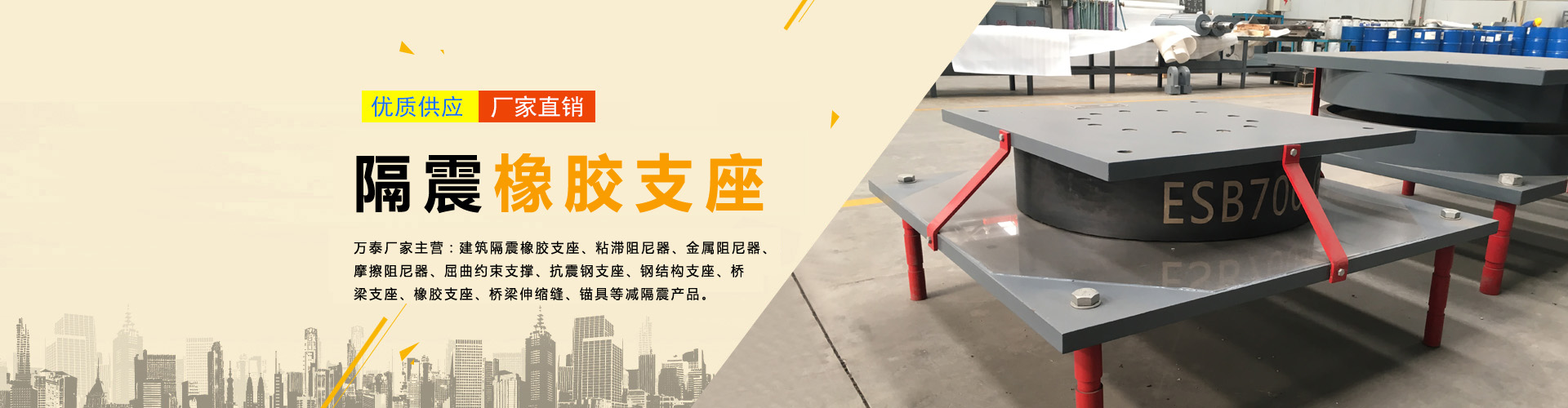 我公司專業(yè)設(shè)計(jì)、生產(chǎn)、銷售建筑橋梁減隔震產(chǎn)品。隔震產(chǎn)品主要有:隔震橡膠支座、鉛芯橡膠支座、抗拉裝置、抗風(fēng)裝置;減震產(chǎn)品主要有:屈曲約束支撐、剪切型金屬阻尼器、摩擦阻尼器、連梁阻尼器、粘滯阻尼器、粘滯阻尼墻、粘彈阻尼器;機(jī)電抗震產(chǎn)品主要有:設(shè)備隔震支座、設(shè)備減震墊板;網(wǎng)架及鋼結(jié)構(gòu)支座系列產(chǎn)品主要有:網(wǎng)架橡膠支座、球型鋼支座、球鉸支座、減震鋼支座、網(wǎng)架抗拉支座;橋梁支座產(chǎn)品主要有:盆式支座、球型支座、橡膠支座、摩擦擺式支座、高阻尼隔震支座、水平分散力支座、鉛芯隔震支座、防落梁裝置、抗震擋塊;橋梁伸縮裝置系列產(chǎn)品主要有:模數(shù)式伸縮裝置、梳齒板型伸縮裝置、多向變位式伸縮裝置。 本公司全體員工...... 【更多詳情】